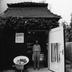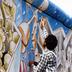 Young man in the squatted house at Schliemannstraße; a GDR national flag in the background