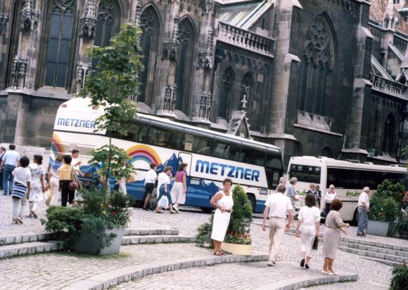 "Church at the Fisherman's Bastion - an excursion to Budapest. Buses belonging to the American choir who had practiced in the church."