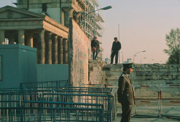 At the new border crossing at Brandenburg Gate, which was opened in a ceremony on 22 December 1989. Over 100,000 people and hundreds of camera teams attended the ceremony, presided over by Chancellor Helmut Kohl and Chairman of the GDR Council of Ministers, Hans Modrow.