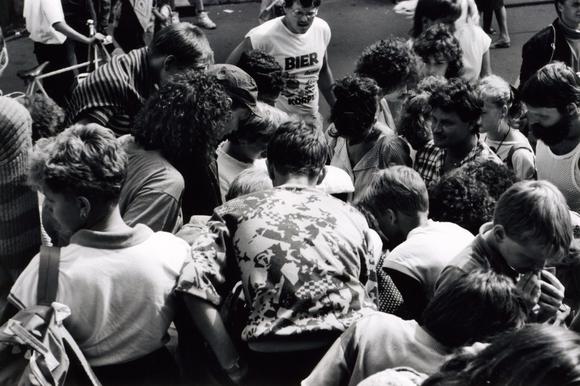 "Summer bicycle trip from Stralsund to Boltenhagen. Thronging crowd around the monger's stall."