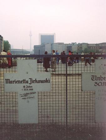 Passanten vor dem 1971 von einem privaten Berliner Bürger-Verein eingerichteten Gedenkort "Weiße Kreuze" für die Todesopfer der Mauer, siehe auch