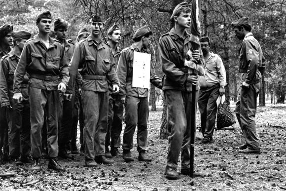 "Anlass: GST-Lager der 11.Klasse der EOS "Friedrich List", Berlin-Pankow. Kommentar: der Marschbereite Zug "Ernst Thälmann", vorn der Zugführer, rechts 2 Lehrer von der EOS "Carl v. Ossietzky", unsere Ausbilder."