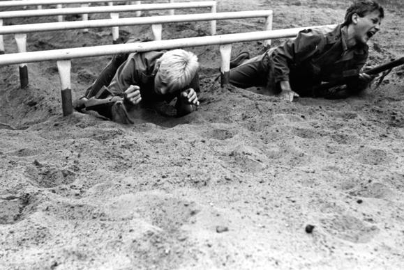 Youths at the military compound at "Gesellschaft für Sport und Technik" ('society for sport and technology'), a paramilitary youth organization in East Germany that carried out the compulsory premilitary training in cooperation with the NVA (National People's Army)