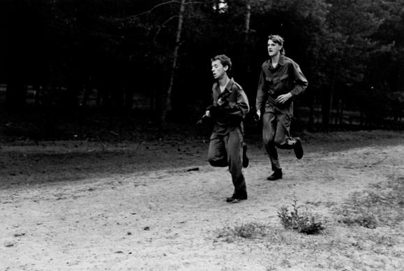 Youths at the military compound at "Gesellschaft für Sport und Technik" ('society for sport and technology'), a paramilitary youth organization in East Germany that carried out the compulsory premilitary training in cooperation with the NVA (National People's Army)