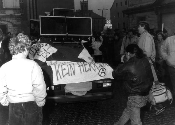 Der letzte Dienstag des Jahres 1989 war u.a. auch durch eine Demo gekennzeichnet, die nicht von Parteien und politischen Vereinigungen organisiert wurde. Sie fand bereits zur Mittagsstunde statt. Ihre Hauptinhalte waren gegen Ausländerfeindlichkeit, gegen Rechtsradikale und für eine multikulturelle Gesellschaft gerichtet." (Klaus Bergmann: Weimar-Demos 1989/90 in Bildern. Weimar 1992, S. 67)