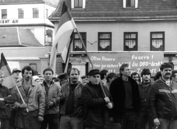 "7.2.1990: Bauerndemo Schon einen Tag nach der letzten Dienstagsdemo versammelten sich auf dem Theaterplatz Hunderte Bauern, um auf ihre Belange aufmerksam zu machen. Die Bauern fühlten sich auch dem Volk angehörend und schilderten die missliche Situation der Landwirtschaft wie fehlende moderne Technik und Zukunftsängste." (Klaus Bergmann: Weimar-Demos 1989/90 in Bildern. Weimar 1992, S. 100)