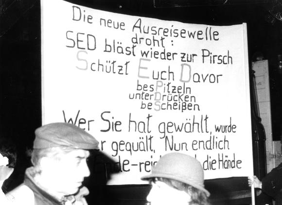 Protestschild "Die neue Ausreisewelle droht"