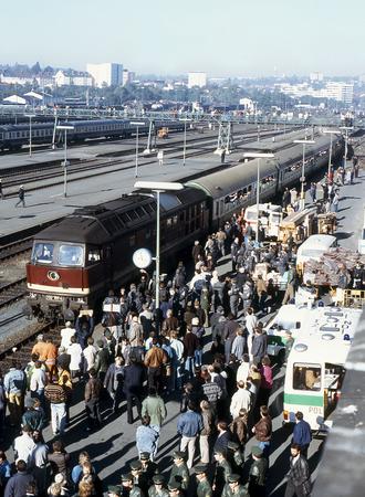 Thousands of East German refugees travelled with special East German Railway trains, arriving in the West German town of Hof in October 1989. After fleeing to the German Embassy in Prague, many of the people had been there since August until finally granted permission to leave the country on 30 September.