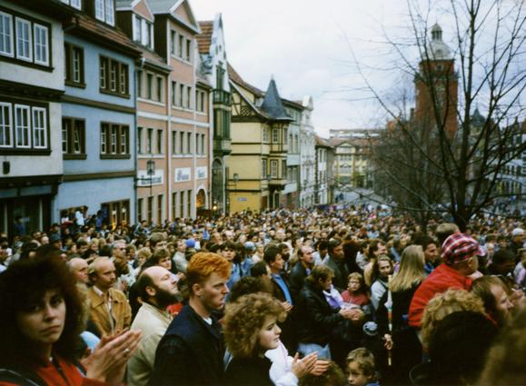 Mass rally at the central marketplace in Gotha; city council headquarters, City Hall, in the background
