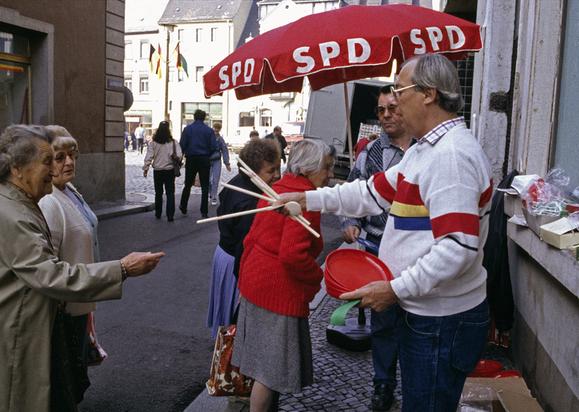 Gifts are handed out at an SPD information stand