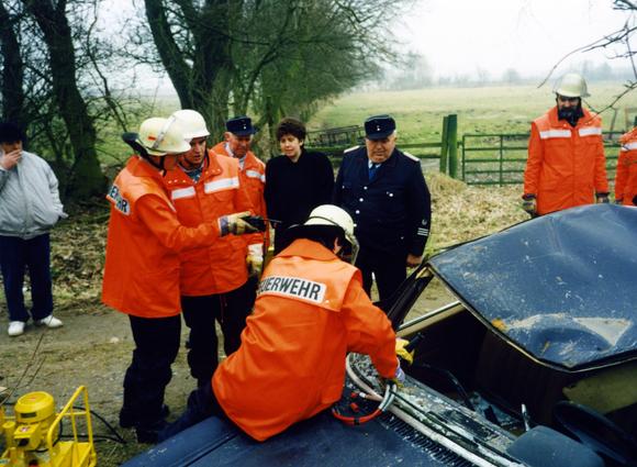 "Auch der Aufbau einer zeitgemäßen Feuerwehr gehört zum Aufbau einer Kommune. Hier: Erste gegenseitige Kontakt- und 'Lernbesuche' von Bürgermeistern und Abgeordneten der Gemeinden Groß Köris und Lohe-Rickelshof, Schleswig-Holstein, die bis heute zu persönlichen Freundschaften führten."