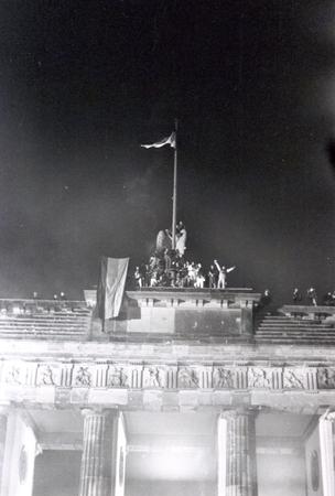 "Silvester 1989/90 am Brandenburger Tor. Die Fahnen wurden auf dem Brandenburger Tor im Minutentakt gewechselt; u.a. wurden die Europäische und die kanadische Fahne aufgezogen."