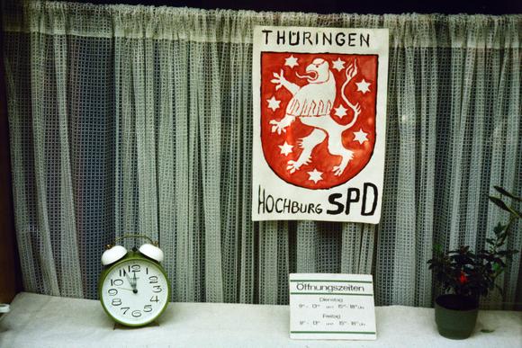 Handmade SPD election poster featuring the Thuringian coat of arms in a shop window