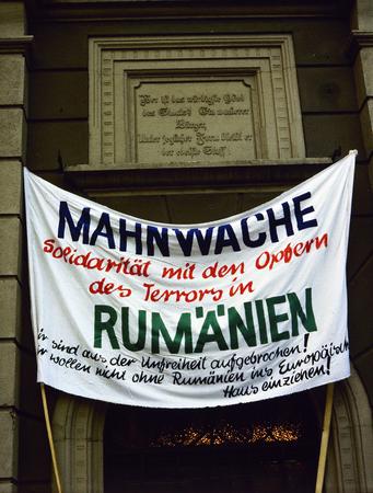 Mahnwache / Solidarität mit den Opfern / des Terrors in / Rumänien / Wir sind aus der Unfreiheit aufgebrochen! / Wir wollen nicht ohne Rumänien in's Europäische / Haus einziehen!