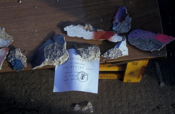 [C]ertificate / Your authentic piece of / The Berlin Wall / Removed from: Checkpoint Charlie / Date: 01/15/90 / Attested: [...] / Von der Berliner Mauer