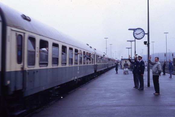 "Grenzöffnung 1989. Flüchtlingszüge am Bahnhof Hof. Am 1.Oktober kamen 6 Sonderzüge mit 5490 Prager Botschaftsflüchtlingen, am 5.Oktober kamen 8 Sonderzüge mit 7607 Prager Botschaftsflüchtlingen. Weiterleitung nach Gießen, Hammelburg, Weiden, Naabburg, Schwandorf, Nürnberg, Coburg, Oerlenbach. Nach Grenzöffnung am 9.11. kamen am 17.11. 14 Züge mit ca. 31.000 Reisenden über Gutenfürst nach Hof, zusätzlich derer die im Auto kamen. Im November und Dezember kamen täglich bis zu 40.000 Reisende am Hofer Hauptbahnhof an! In Hof-Stadt wurden bis zum 31.Dezember 1989 in 20 Zahlstellen (einschließlich der Postämter) über 91 Millionen DM Begrüßungsgeld ausbezahlt!"