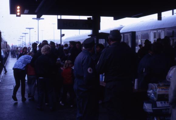 "Grenzöffnung 1989. Flüchtlingszüge am Bahnhof Hof. Am 1.Oktober kamen 6 Sonderzüge mit 5490 Prager Botschaftsflüchtlingen, am 5.Oktober kamen 8 Sonderzüge mit 7607 Prager Botschaftsflüchtlingen. Weiterleitung nach Gießen, Hammelburg, Weiden, Naabburg, Schwandorf, Nürnberg, Coburg, Oerlenbach. Nach Grenzöffnung am 9.11. kamen am 17.11. 14 Züge mit ca. 31.000 Reisenden über Gutenfürst nach Hof, zusätzlich derer die im Auto kamen. Im November und Dezember kamen täglich bis zu 40.000 Reisende am Hofer Hauptbahnhof an! In Hof-Stadt wurden bis zum 31.Dezember 1989 in 20 Zahlstellen (einschließlich der Postämter) über 91 Millionen DM Begrüßungsgeld ausbezahlt!"