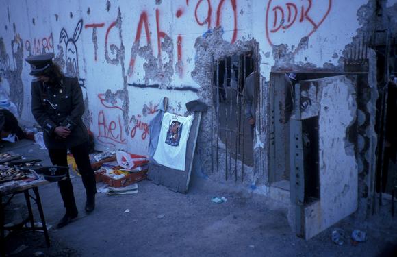 Souvenirhandel an der Mauer, rechts eine von der Ostseite fotografierte Tür in der Mauer. "Solche Teile mit tresorartiger Schlupftür soll es Historikern zufolge rings um Berlin nur sechs oder acht Mal gegeben haben." (