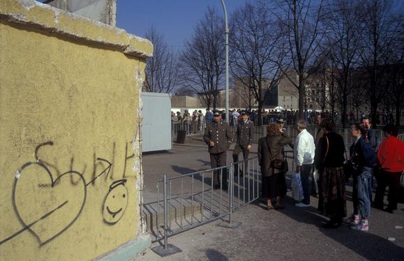 At the border crossing at Brandenburg Gate, which was opened in a ceremony on 22 December 1989. Over 100,000 people and hundreds of camera teams attended the ceremony, presided over by Chancellor Helmut Kohl and Chairman of the GDR Council of Ministers, Hans Modrow.