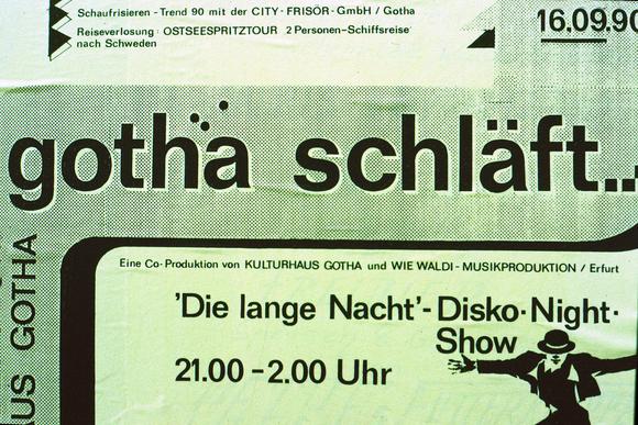 Schaufrisieren - Trend 90 mit der City-Frisör-Gmbh/Gotha / Reiseverlosung: Ostseespritztour 2 Personen-Schiffsreise / nach Schweden / 16.09.90 / Gotha schläft.. / Eine Co-Produktion von Kulturhaus Gotha und Wie Waldi-Musikproduktion/Erfurt / 'Die lange Nacht'–Disko-Night-/ Show / 21.00–2.00 Uhr