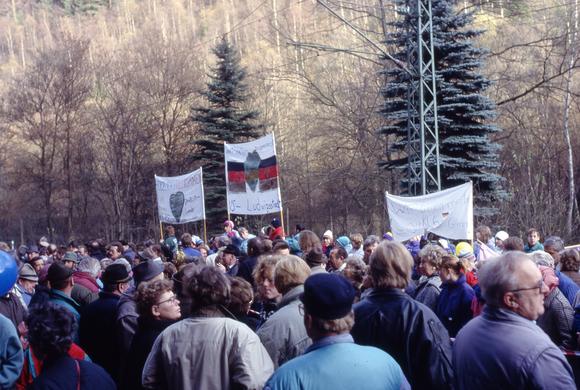 Crowds of people at the new border crossing between Lauenstein, a part of the Bavarian city Ludwigsstadt, and the Thuringian town of Probstzella. The border crossing was opened to pedestrian and road traffic on 12 and 13 November, 1989, respectively. The photo was taken near Falkenstein cliff, after which the border crossing was named.