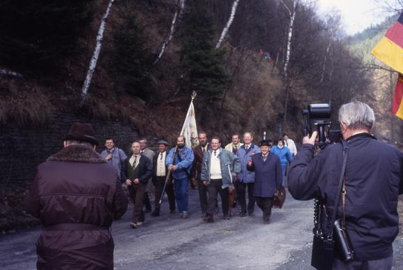 Am Grenzübergang zwischen Lauenstein, einem Stadtteil der bayerischen Stadt Ludwigsstadt, und der thüringischen Gemeinde Probstzella bei der Öffnung der innerdeutschen Grenze. Die Öffnung des Grenzübergangs fand am 12. November 1989 für Fußgänger und am 13. November 1989 für den Straßenverkehr statt. Die Aufnahme entstand in der Nähe des Felsens Falkenstein, der dem Grenzübergang den Namen gibt.