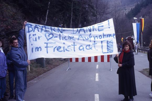 DDR-Bürger mit einem Transparent am Grenzübergang zwischen Lauenstein, einem Stadtteil der bayerischen Stadt Ludwigsstadt, und der thüringischen Gemeinde Probstzella. Die Öffnung des Grenzübergangs fand am 12. November 1989 für Fußgänger und am 13. November 1989 für den Straßenverkehr statt. Die Aufnahme entstand in der Nähe des Felsens Falkenstein, der dem Grenzübergang den Namen gibt.