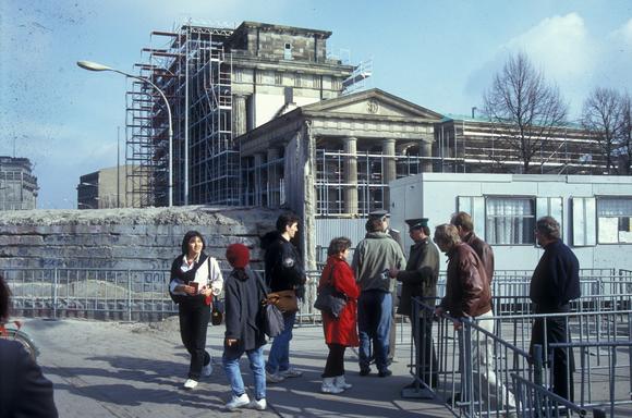 Am Grenzübergang Brandenburger Tor, das 1990/91 restauriert wurde. Die in der Silvesternacht 1989/90 stark beschädigte Quadriga erhielt im Rahmen dieser Restaurierung das Eiserne Kreuz und den Adler zurück; während der Zeit der DDR hielt die geflügelte Siegesgöttin Viktoria einen Stab mit einem Eichenlaubkranz in der Hand.