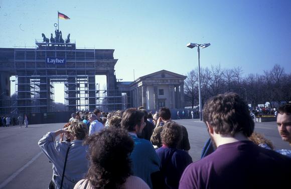 Warteschlange vor dem Grenzübergang Brandenburger Tor, das 1990/1991 restauriert wurde. Die in der Silvesternacht 1989/1990 stark beschädigte Quadriga erhielt im Rahmen dieser Restaurierung das Eiserne Kreuz und den Adler zurück; während der Zeit der DDR hielt die geflügelte Siegesgöttin Viktoria einen Stab mit einem Eichenlaubkranz in der Hand. ,Queue in front of the Brandenburg Gate border crossing, restored in 1990/91. The quadriga atop Brandenburg Gate suffered severe damage during festivities on New Year's Eve 1989/90 and the Iron Cross and Eagle were reinstalled as part of the restoration process. During the GDR era, the statue of Victoria, the winged godess of victory, held a staff with an oak leaf wreath in her hand.