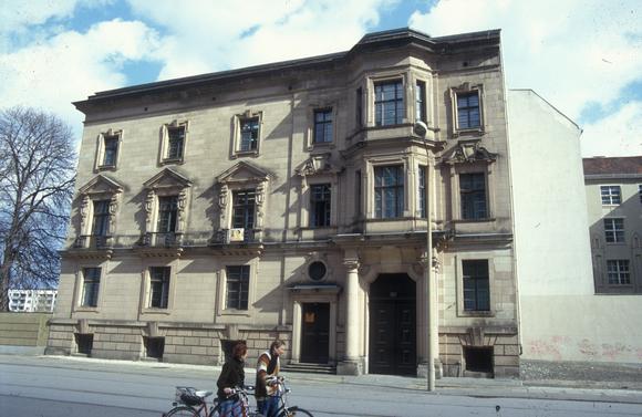 Wikipedia: Reichstagspräsidentenpalais, Stand 3. Juli 2009,Constructed between 1899 and 1904, the Presidential Palace was refurbished after the end of the war in 1945, with the exception of the eastern section of the building. During the time of East Germany it was subject to a variety of uses, one of which included housing the head office of "VEB Deutsche Schallplatten" (the GDR's monopolistic music publisher) for many years. From 1961 to 1989 the building flanked the Berlin Wall which ran between the Palais and Reichstag buildings. It is currently the seat of the German Parlamentary Association. Refer to