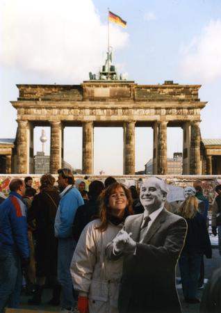 A woman poses with a cardboard cutout of Mikhail Gorbachev, the then president of the Soviet Union