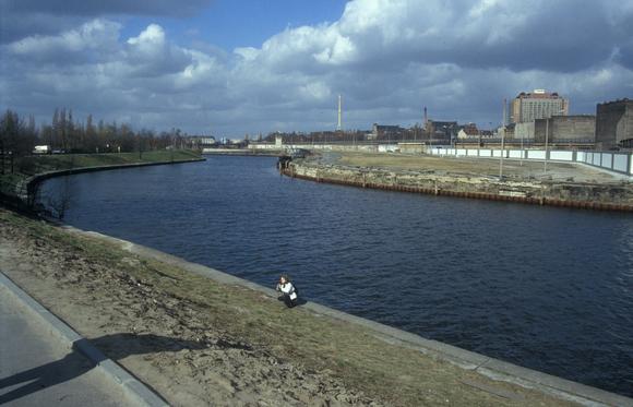 Partially cleared border strip along Reichstagufer; the opposite riverbank where the Berlin Wall has already been dismantled; the still intact structure of the Hinterlandmauer (inner Eastern Wall) in the background