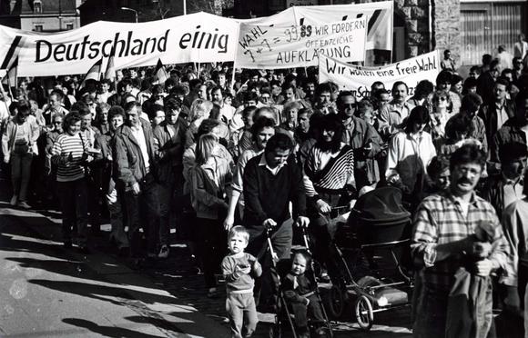 Banner,"We want democratic elections". Demonstrators with banners, presumably taken during one of the mass protests in Plauen (Saxony), that were held every Saturday from 7 October 1989 until the first democratic elections took place on 18 March, 1990. (retreived and translated from