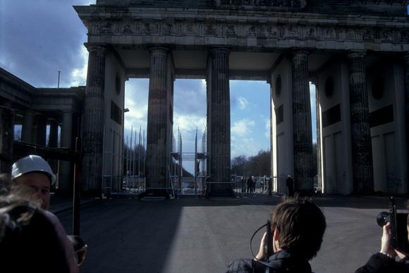 Photographers at Brandenburg Gate, restored in 1990/1991. The Quadriga atop Brandenburg Gate suffered severe damage during festivities on New Year's Eve 1989/90 and during the course of restoration the Iron Cross and Eagle were reinstalled. During the GDR era, the statue of Victoria, the winged godess of victory, held a staff with an oak leaf wreath in her hand.