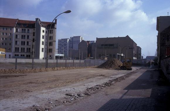 Ehemaliger Grenzstreifen am Checkpoint Charlie, im Vordergrund Spuren des Mauerfundaments der bereits abgebauten Berliner Mauer