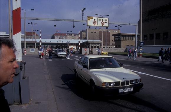 Am Grenzübergang Friedrichstraße (Checkpoint Charlie), während der Zeit der Mauer einer der sieben Straßenübergänge zwischen Ost- und West-Berlin (zwischen sowjetischem und US-amerikanischen Sektor), der von Ausländern, Angehörigen der alliierten Streitkräfte und Diplomaten benutzt werden musste