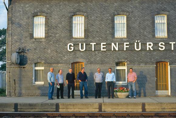 "Hof depot train drivers received training in order to be allowed to navigate the Deutsche Reichsbahn railway network. Train drivers from Hof and Plauen seized the opportunity to take this photo at Gutenfürst station while on a short break during personnel-training trips.