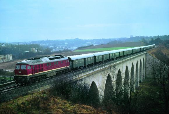 "Diesellok BR 132, Bw Reichenbach auf Brücke in Hof-Unterkotzau, Saale-Viadukt. Aufgrund Wagenmangels im gesamtdeutschen Reiseverkehr, der durch die Grenzöffnung entstanden ist, mußte alles an Wagen beschafft werden, was irgendwie übrig war.