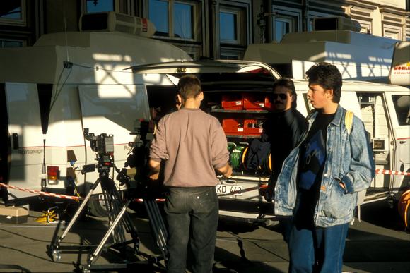Camera team at Hof central station awaiting the arrival of refugee trains. Thousands of East German refugees travelled with special East German Railway trains, arriving in the West German town of Hof in October 1989. After fleeing to the German Embassy in Prague, many of the people had been there since August until finally granted permission to leave the country on 30 September.