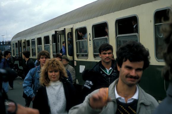 Thousands of East German refugees travelled with special East German Railway trains, arriving in the West German town of Hof in October 1989. After fleeing to the German Embassy in Prague, many of the people had been there since August until finally granted permission to leave the country on 30 September.