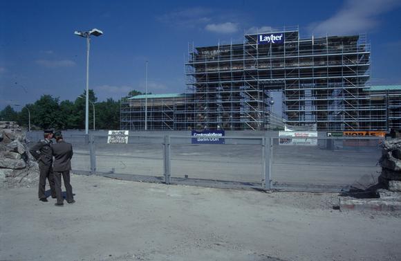 The Quadriga atop Brandenburg Gate suffered severe damage during festivities on New Year's Eve 1989/90 and underwent restoration in 1990/1991, when the Iron Cross and Eagle were reinstalled. During the GDR era, the statue of Victoria, the winged godess of victory, held a staff with an oak leaf wreath in her hand.