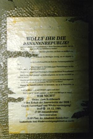 "Wollt Ihr die Bananenrepublik?" (Do you want a banana republic?) notice, with a call for demonstration from the Studentischen Anti-Wiedervereinigungsinitiativen Berlin (the Student Anti-reunification Initiative Berlin)