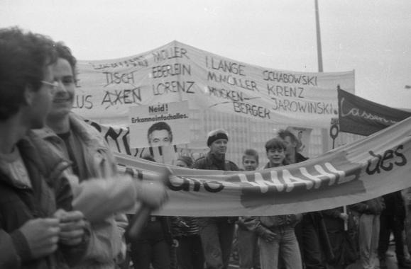 Protestors with banners at the Alexanderplatz demonstration, "the largest anti-government demonstration(s) in the history of the GDR" (retrieved and translated from