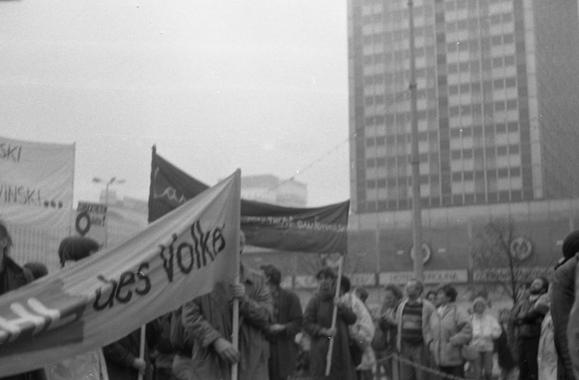 Protestors with banners at the Alexanderplatz demonstration, "the largest anti-government demonstration(s) in the history of the GDR" (retrieved and translated from Wikipedia: Alexanderplatz-Demonstration, on April 23, 2009)