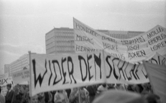 Banners at the Alexanderplatz demonstration, "the largest anti-government demonstration(s) in the history of the GDR" (retrieved and translated from