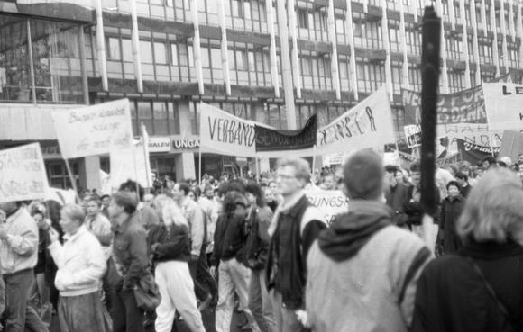 Demonstranten mit Transparenten bei der Alexanderplatz-Demonstration, der "größte[n] nicht staatlich gelenkte[n] Demonstration in der Geschichte der DDR" (