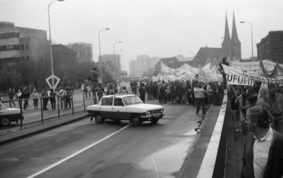 Alexanderplatz demonstration, banderole, crowd, member of the People's Police, Trabant (car)