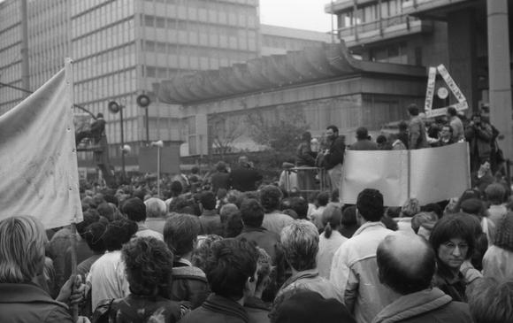 Crowds of people with banners at the Alexanderplatz demonstration, "the largest anti-government demonstration(s) in the history of the GDR" (retrieved and translated from Wikipedia: Alexanderplatz-Demonstration, on April 23, 2009)