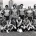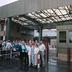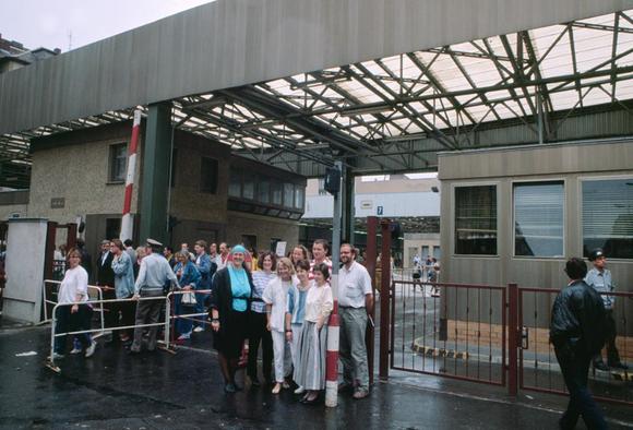 Gruppenfoto am Grenzübergang Friedrichstraße (Checkpoint Charlie), der während der Zeit der Mauer einer der sieben Straßenübergänge zwischen Ost- und West-Berlin (zwischen sowjetischem und US-amerikanischen Sektor) war und der von Ausländern, Angehörigen der alliierten Streitkräfte und Diplomaten benutzt werden musste