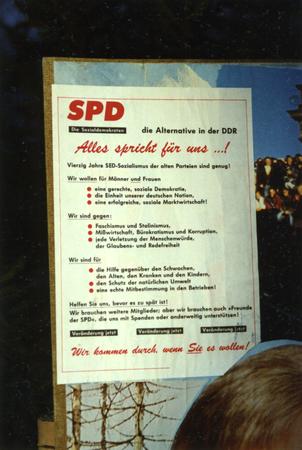 SPD / Die Sozialdemokraten - die Alternative in der DDR / Alles spricht für uns...! / Vierzig Jahre SED-Sozialismus der alten Parteien sind genug! / Wir wollen für Männer und Frauen / eine gerechte, soziale Demokratie / die Einheit unserer deutschen Nation, eine erfolgreiche, soziale Marktwirtschaft! / Wir sind gegen / Faschismus und Stalinismus / Mißwirtschaft, Bürokratismus und Korruption / jede Verletzung der Menschenwürde, der Glaubens- und Redefreiheit / Wir sind für / die Hilfe gegenüber der Schwachen, den Alten, den Kranken und den Kindern / den Schutz der natürlichen Umwelt / eine echte Mitbestimmung in den Betrieben! / Helfen Sie uns, bevor es zu spät ist! Wir brauchen weitere Mitglieder; aber wir brauchen auch "Freunde / der SPD", die uns mit Spenden oder anderweitig unterstützen! / Veränderung jetzt! / Wir kommen durch, wenn Sie es wollen!